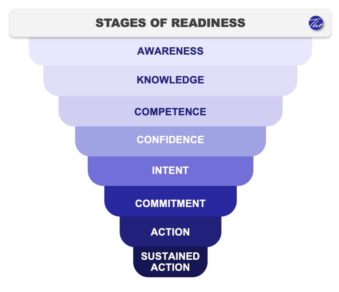 Figure 1. The Readiness to Act Framework: eight sequential stages from awareness to sustained action.