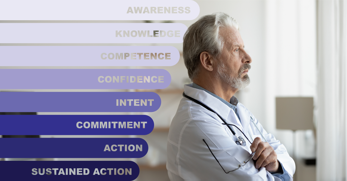 Readiness to Act applies the eight sequential stages established in behavioral change science, from awareness through knowledge, competence, confidence, intent, and commitment, to action and finally sustained action, as the backbone of a measurement and evaluation system. The stages are not arbitrary. They reflect a theoretically grounded sequence: in the same way that you cannot be confident doing something you are not yet competent at, you will not commit to a change you do not yet intend to make.⁴ ⁵ What this gives us that a standard needs assessment does not is a single, interpretable position for each HCP. Instead of scattered, disconnected scores, this gives us a location on a map. And like any good map, it tells you not just where someone is, but what it will take to move them toward a destination.