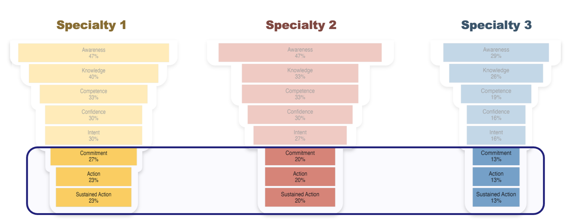 Figure 2. Readiness profiles differ meaningfully across specialties, a finding invisible to undifferentiated needs assessments. Each profile implies a distinct educational strategy.